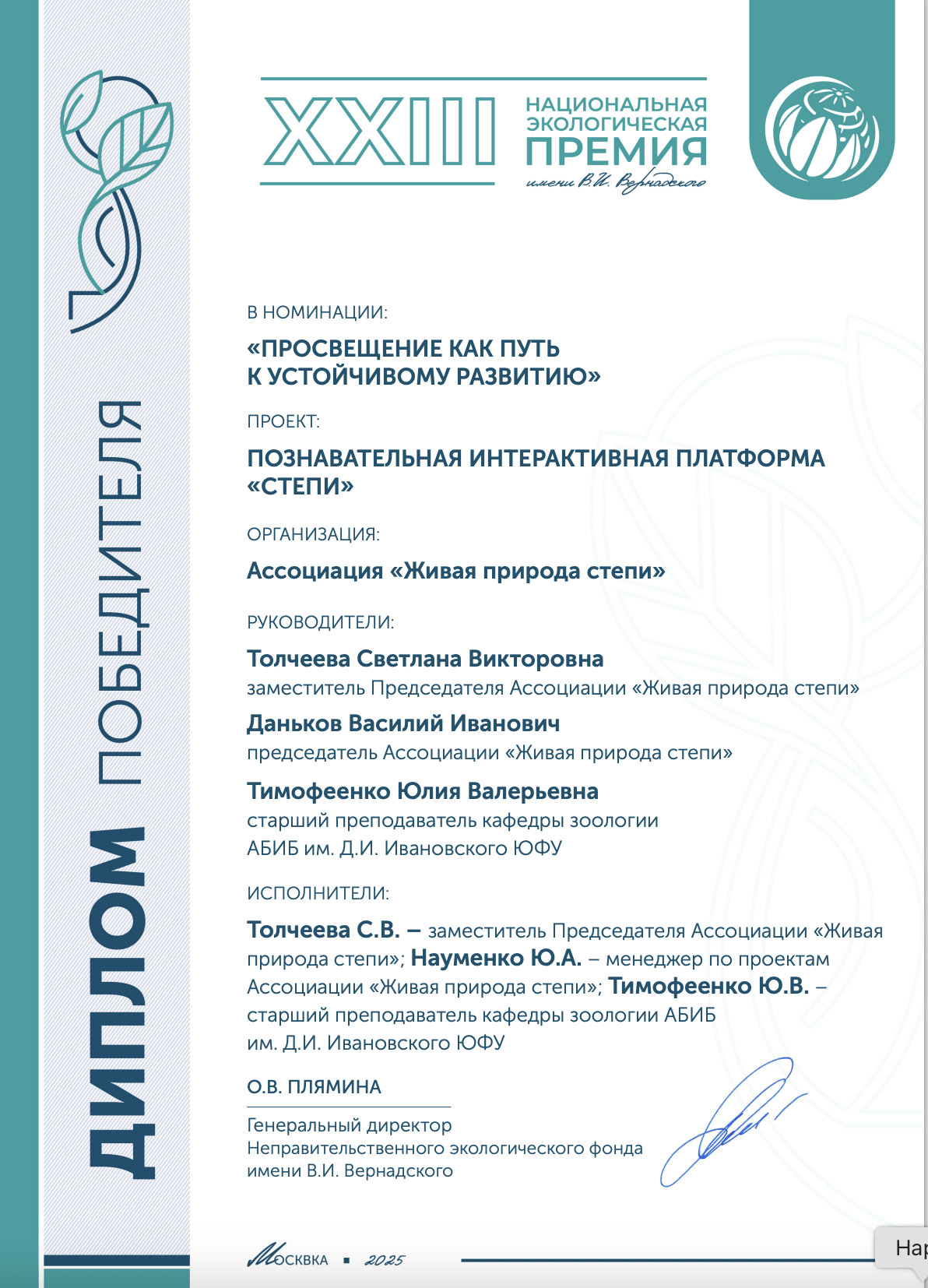 Ассоциация «Живая природа степи» стала победителем XXII конкурса «Национальная экологическая премия имени В. И. Вернадского» в номинации «Просвещение как путь к устойчивому развитию».
