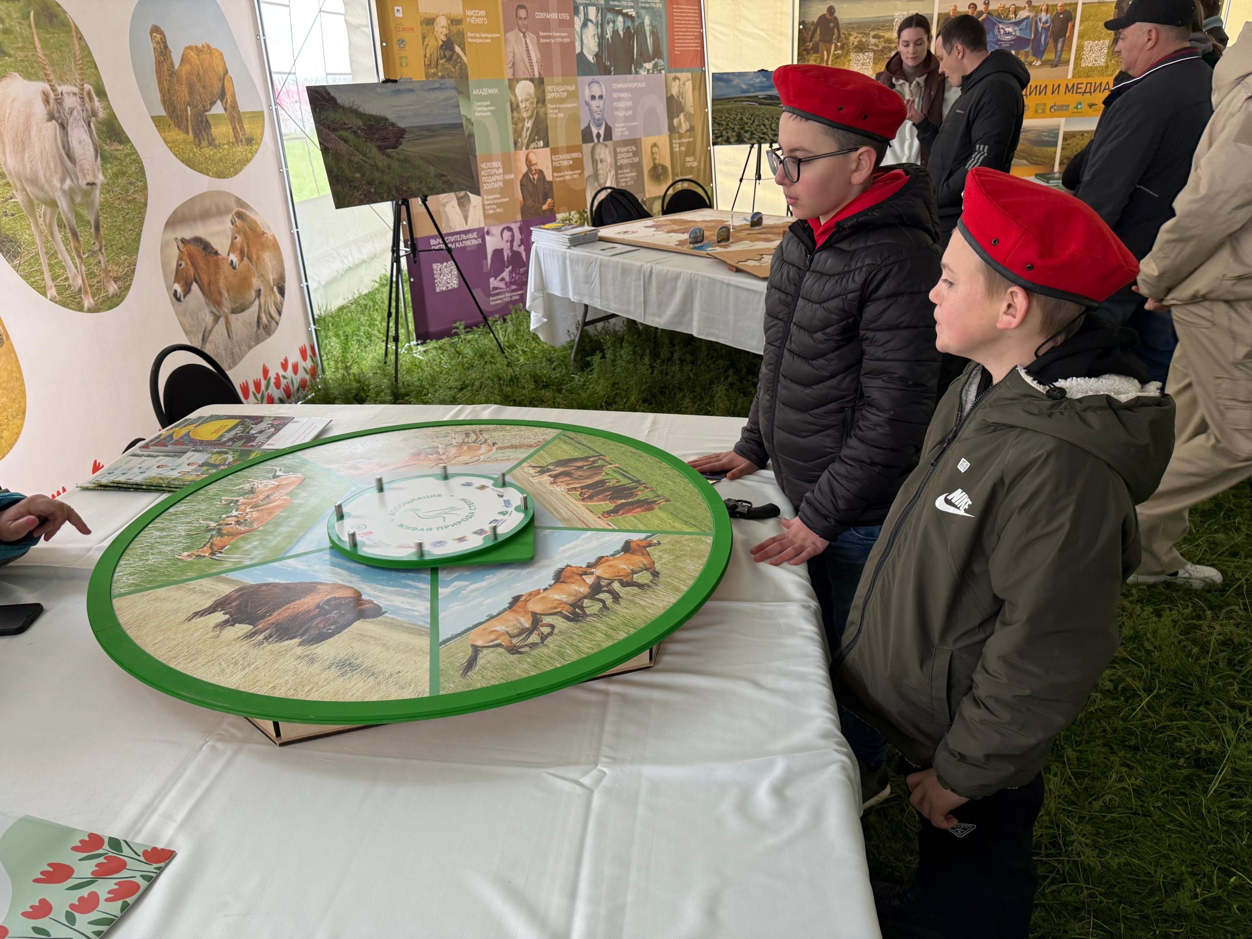 В рамках площадки, организованной Ассоциацией «Живая природа степи», посетителям был предложен занимательный природный аналог «Поле чудес». Вращая барабан, разделённый на сектора с изображениями бизонов, сайгаков, лошадей Пржевальского, куланов и верблюдов, игроки не только развлекались, но и узнавали интересные факты о степной фауне. С каждым поворотом барабана перед ними открывались новые загадки и вопросы, связанные с животными. Например, участники могли узнать, что основной рацион бизона состоит из травы, а верблюды благодаря особому строению ноздрей — турбинатам — хорошо адаптированы к засушливому климату. Или выяснить, что свисающий нос сайгака не только помогает очищать воздух, но и согревает его в зимний период.